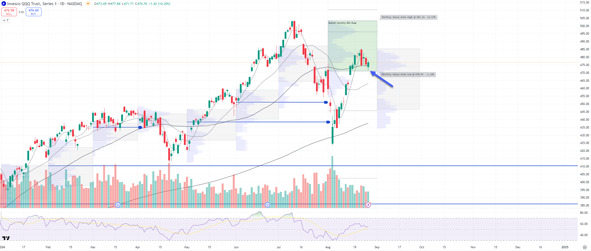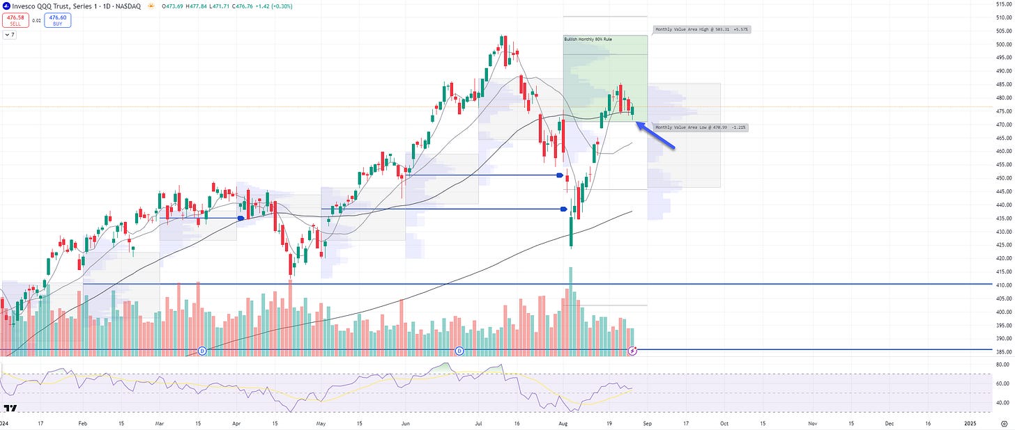 QQQ - NDX 100 ETF- Daily chart: Price ind. -0.1% and price is now at its 50d MA and just inside its Aug Value Area, watch the bottom of the Aug Value Area $471 to see if price holds this support.