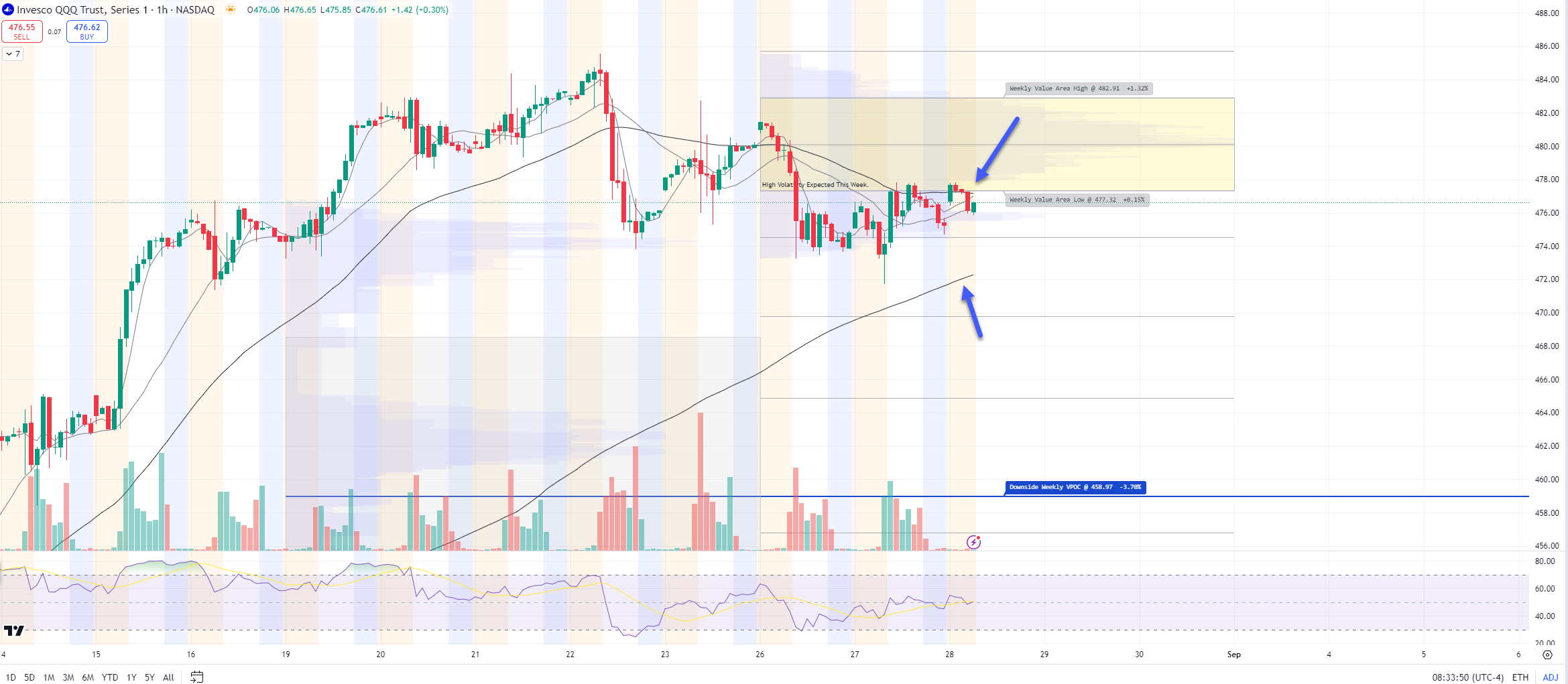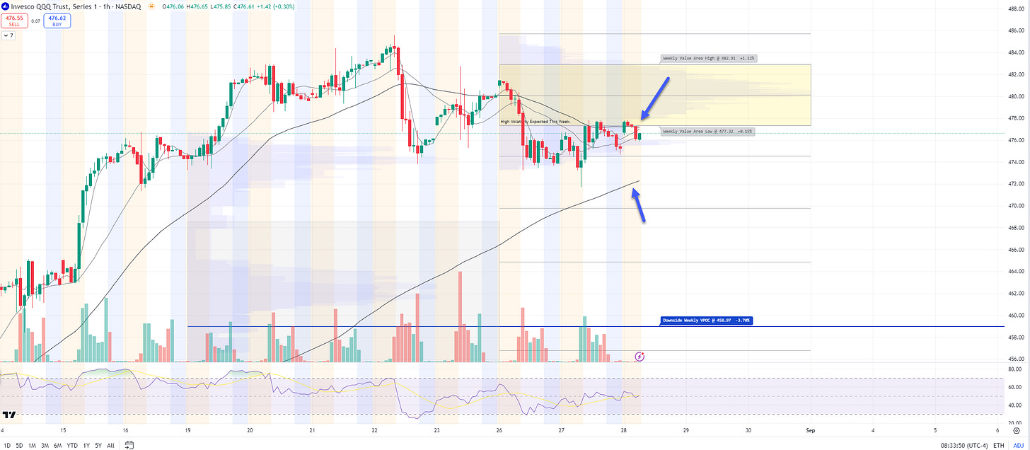 1hr chart: Price is BELOW its Value Area for the week, resistance $477.32