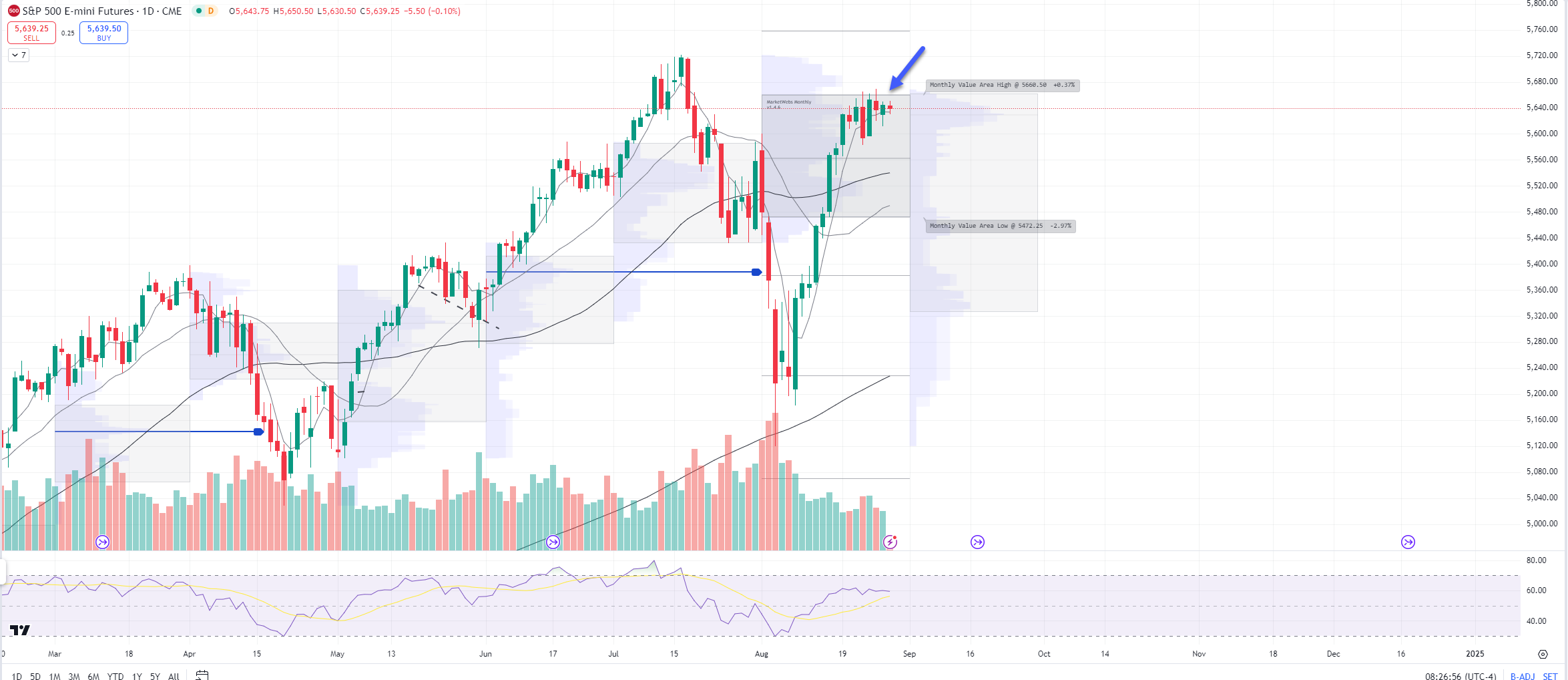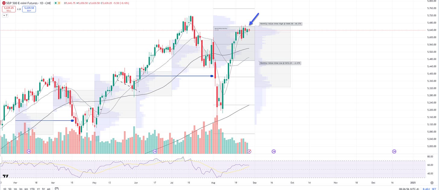 ES_F - SPX Futures - Daily chart: S&P futures ind. -0.1% and remains stuck inside its August Value Area, the level to watch remains 5660.5 resistance and support I am watching is the 5d MA