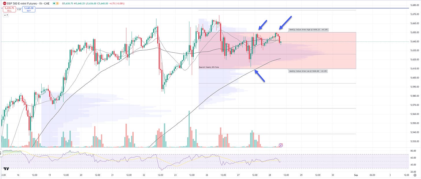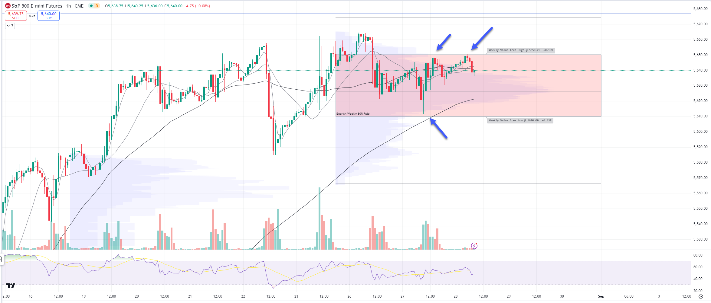1hr chart: Price is INSIDE its Value Area for the week, support 5610 & resistance 5650.25