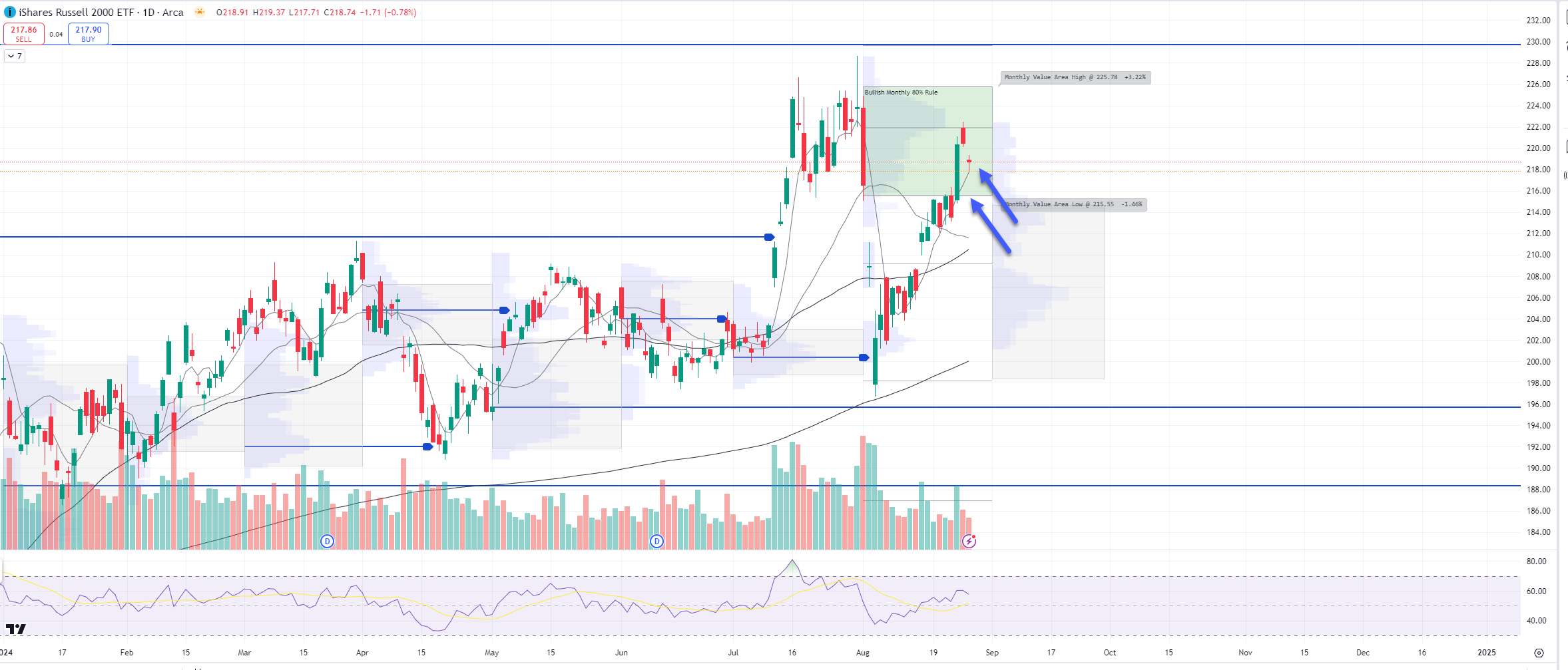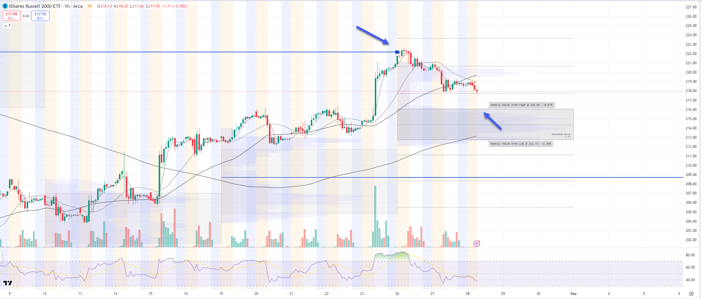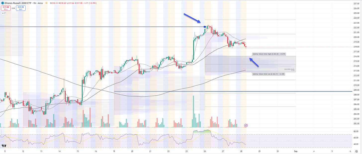 1hr chart: The VPOC (blue line) marked the top for the week and price is moving towards its top of Value Area, watch $216.04 support