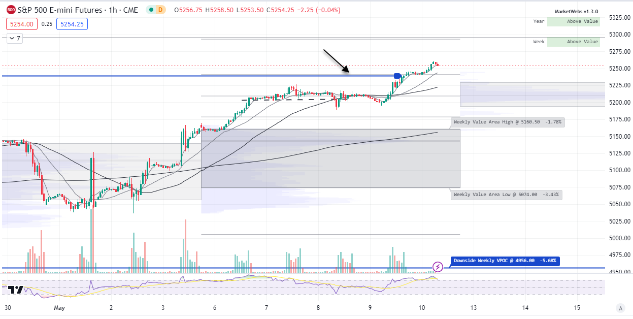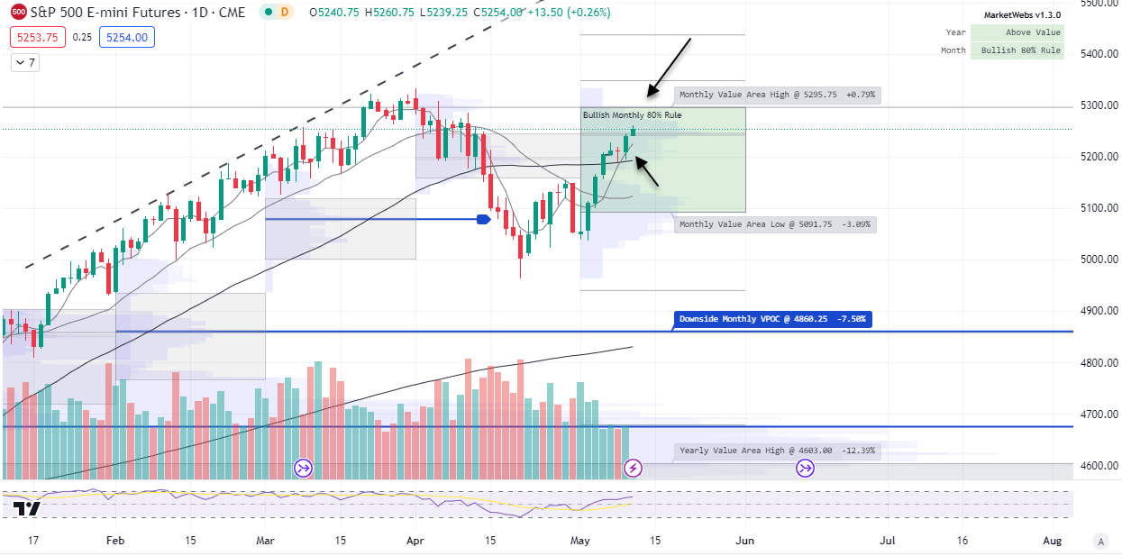 ES_F - SPX Futures - Daily chart: Upside continuation this morning with price ind. +0.3% and the #bullish 80% rule continues to play out, the top of May Value Area resistance is 5295.75