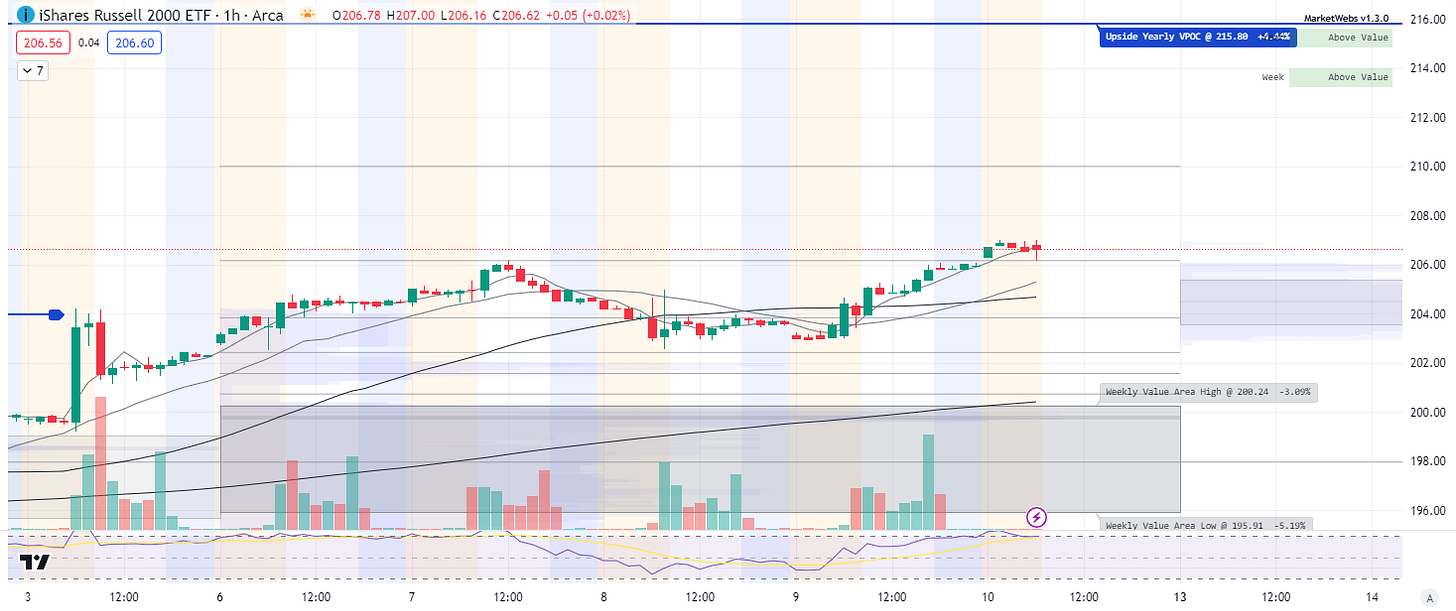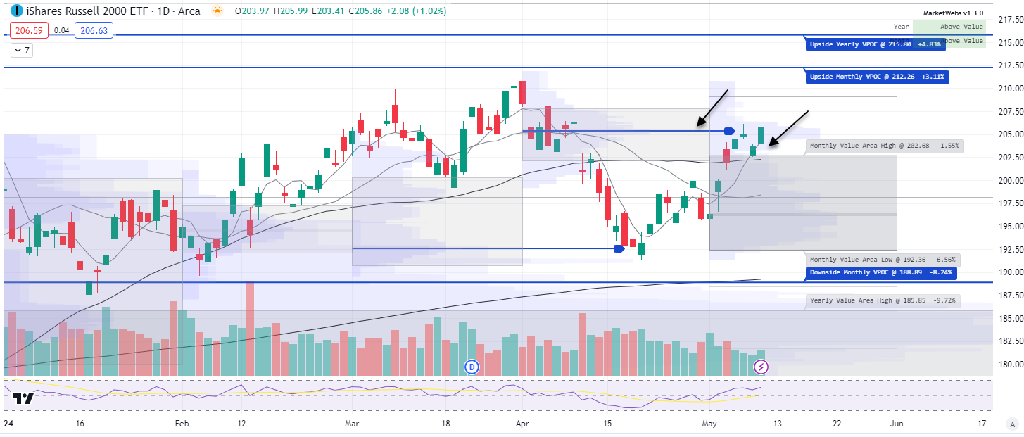 IWM - Russell Small Cap ETF- Daily Chart: Price also ind. +0.4% and is now back to the VPOC take out and remains above its May Value Area, let's see if price can begin to extend above that VPOC take out (blue line) and trend +