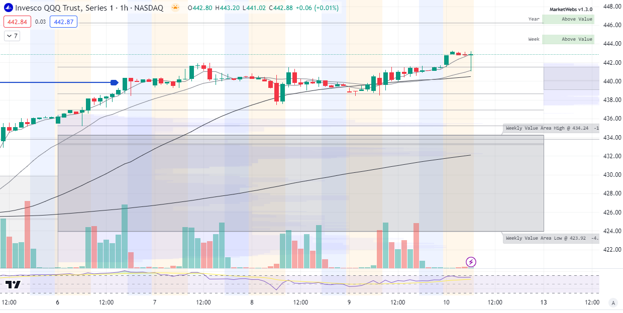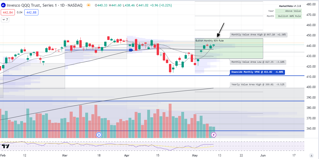 QQQ - NDX 100 ETF - Daily chart: Price ind. +0.4% similar to the S&P is bullish 80% rule remains in effect and price staying above all short term MAs (Moving Averages). Resistance is $447.1 May top of Value Area